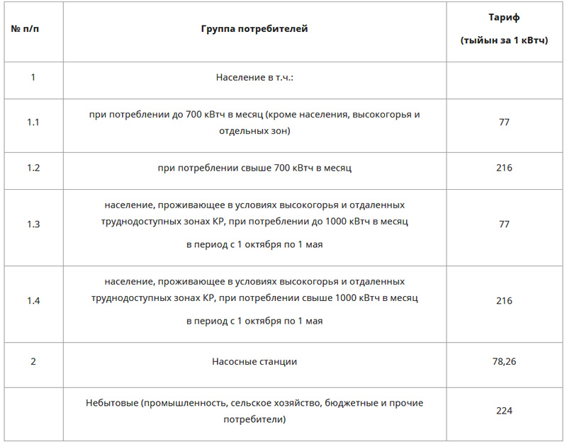 «В соответствии со среднесрочной тарифной политикой (ССТП) с 1 июня 2015 года тариф на электроэнергию для населения, потребляющего до 700 киловатт-часов в месяц, должен был быть установлен в размере 84 тыйынов за киловат-час вместо действующего тарифа в 70 тыйынов за киловатт. Свыше 700 киловатт-часов стоимость электричества составляет 2 сома 20 тыйынов,